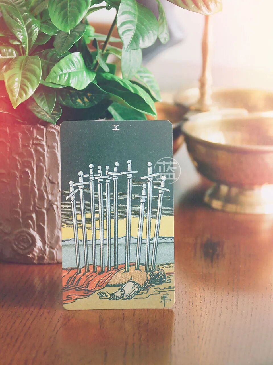 宝剑10代表着结束,但这个结束不是某些意外或刻意为之所导致,而是事情发展到顶点,自然而然出现的结果。这种结束虽然无可避免,但也是一种新的变化,由结束开始的一次转化,再到一个新起点的过程。所以从结果论来看,也许会经历某些痛苦的割舍,但未尝不是一件好事。