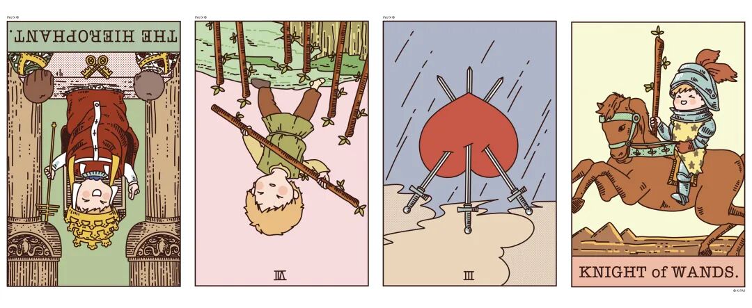 逆位宝剑三、正位权杖骑士