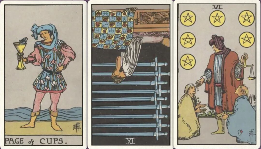 牌:圣杯侍从+ 宝剑九- 星币六+