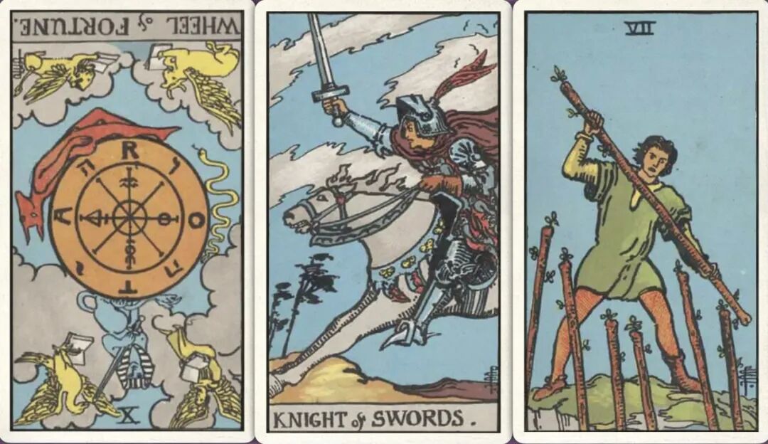 牌:命运之轮- 宝剑骑士+ 权杖七+