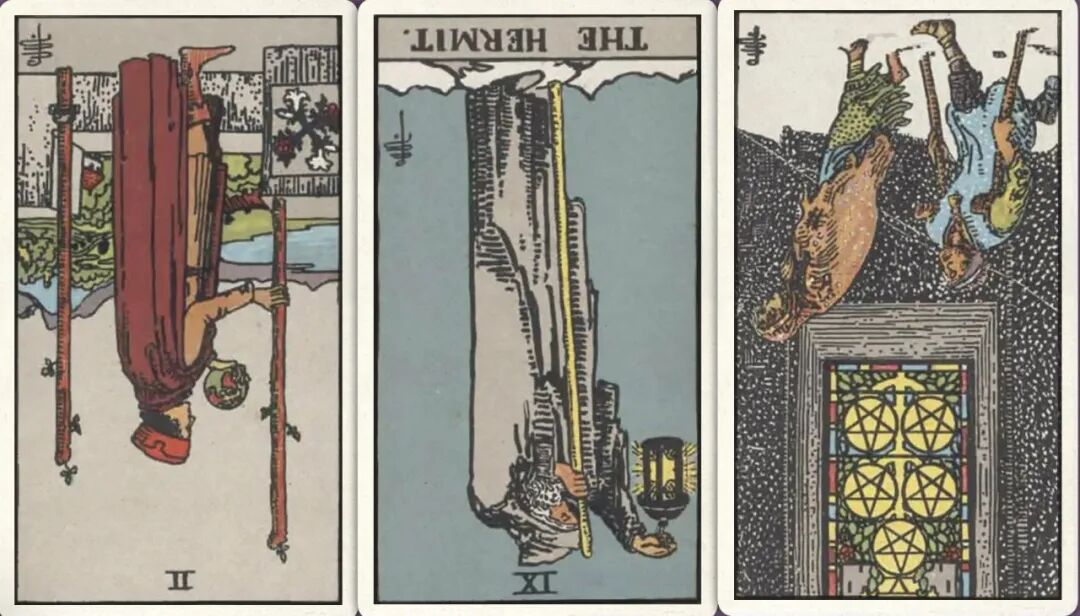 牌:权杖二- 隐士- 星币五-
