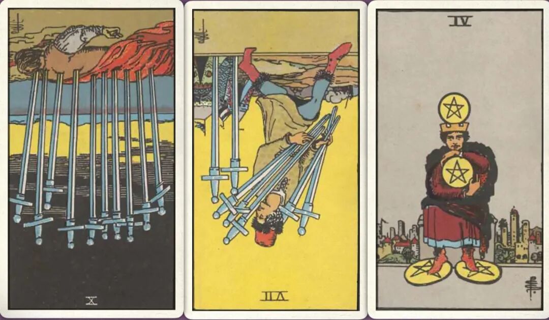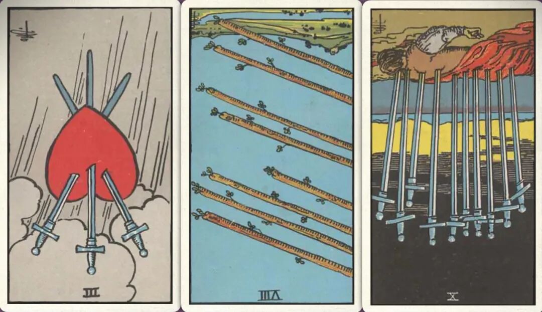 牌:宝剑三- 权杖八- 宝剑十-