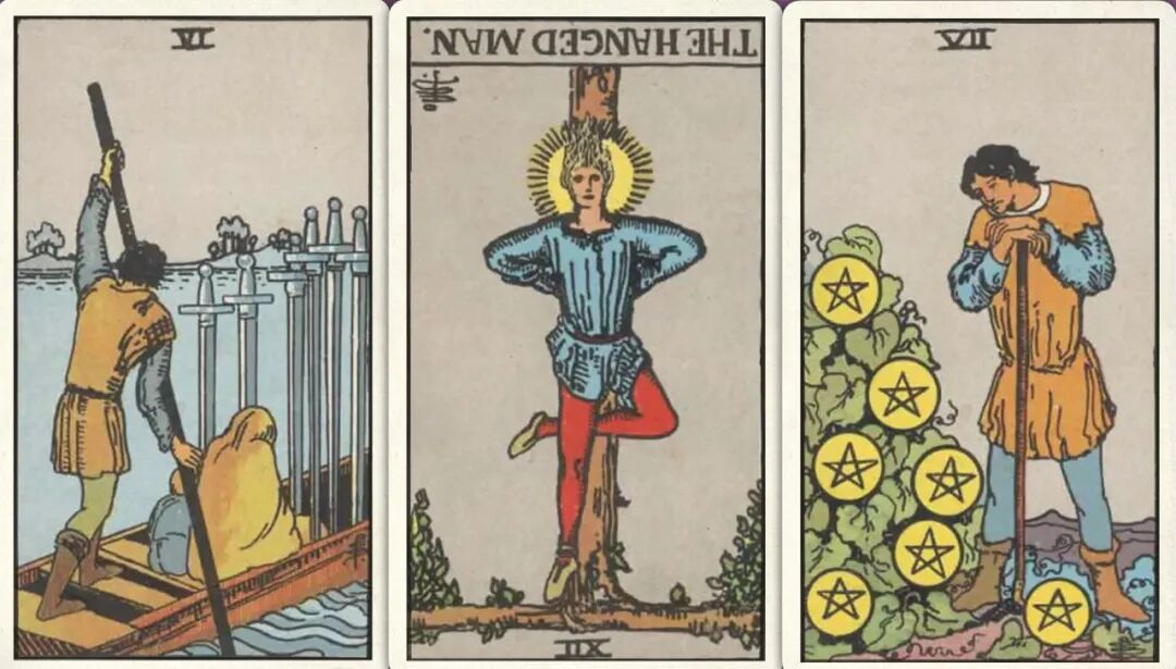 牌:宝剑六- 倒吊人- 星币七+