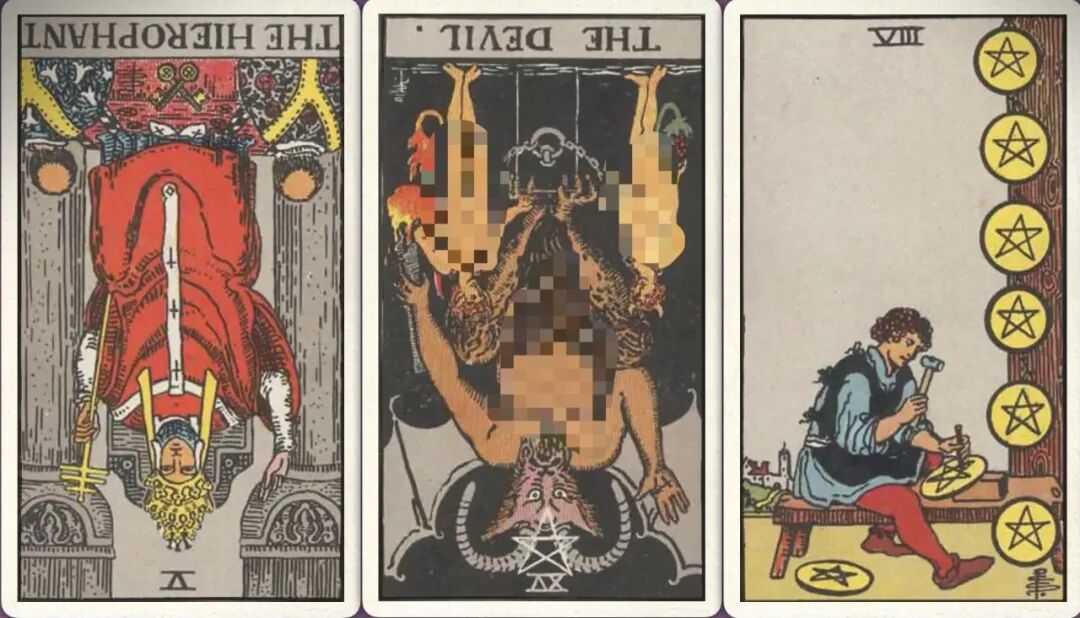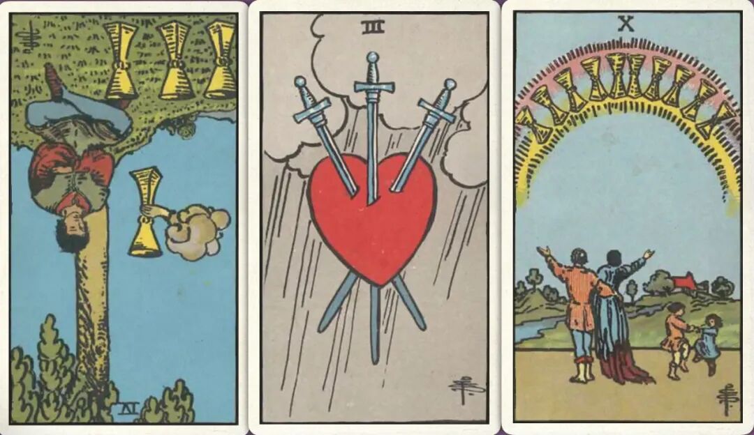 牌:圣杯四- 宝剑三+ 圣杯十+