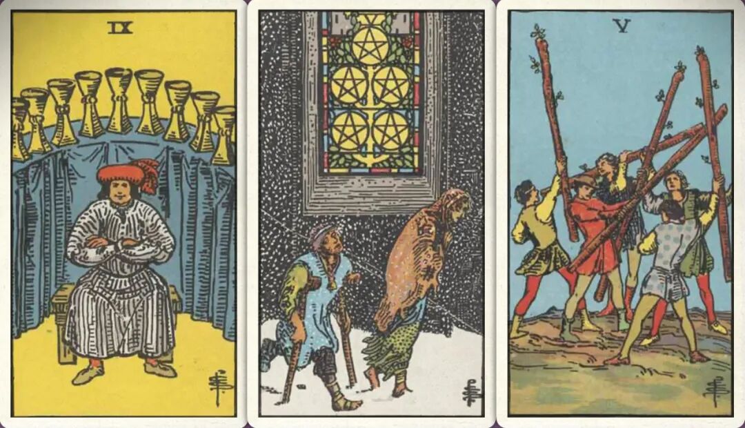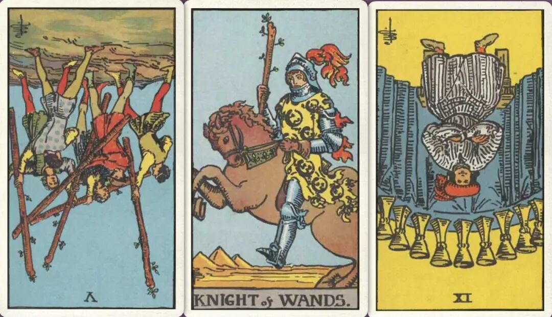 牌:权杖五- 权杖骑士+ 圣杯九-