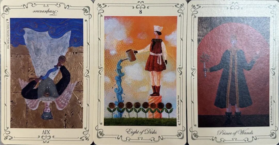 牌:节制- 星币八+ 权杖王子+