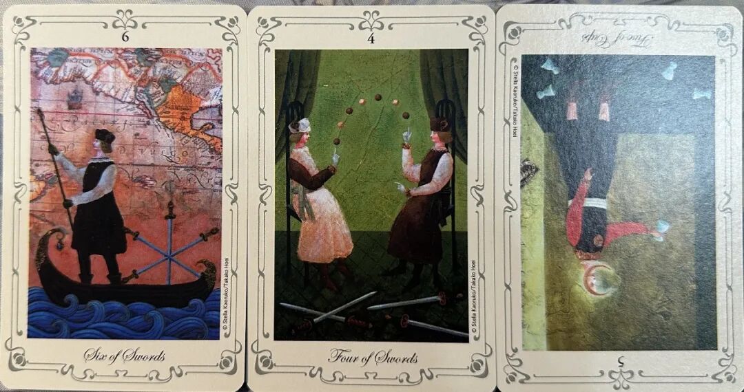 牌:宝剑六+ 宝剑四+ 圣杯五-