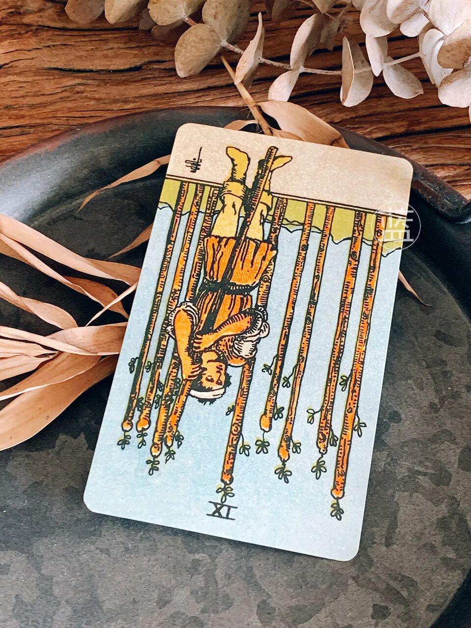 权杖9具有安静的力量,呈现出一种防御的状态,比如戒心、防备心变强。但逆位时则暗示着你内心的溃败,比如之前发生的某些事情你可能还是无法面对,或者某些内心的关卡你还是迈不过去。而从另一方面来说,这种溃败状态,也可能是你目前正面临着某些事情,可能有点快要撑不下去了。