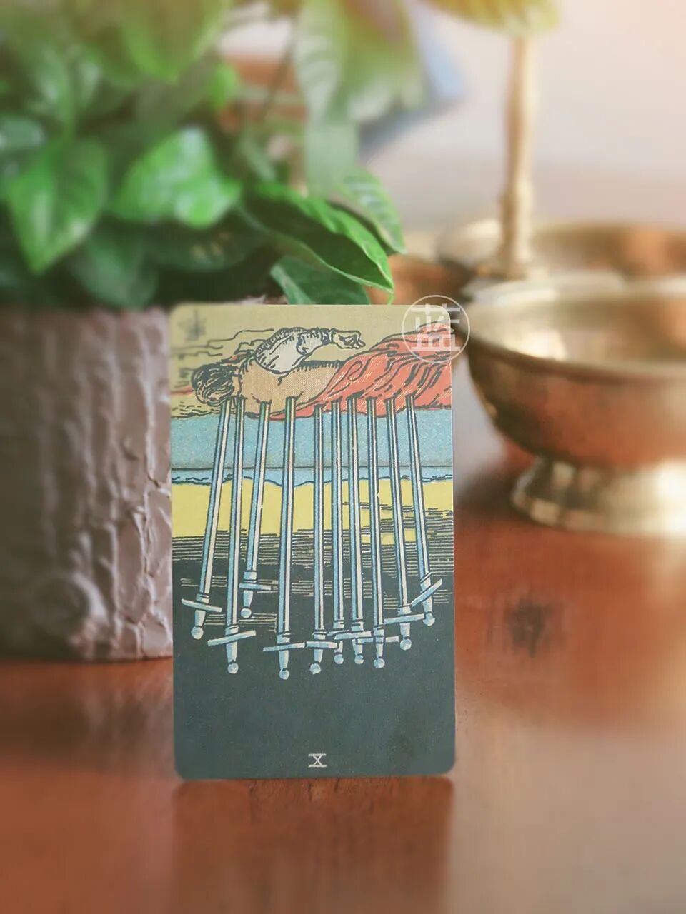 宝剑10代表着结束,这个结束不是某些意外导致,而是事情不断演变发展到顶点后,自然而然出现的结果。这是无可避免的变化,可以看作是由结束到转变,再到一个新起点的过程。而宝剑10的正位和逆位意义相当,但从某些程度上来说,逆位反倒具有更积极的一面,所谓物极必反,负面的事情已达到顶点,势必会立刻去往新的起点。