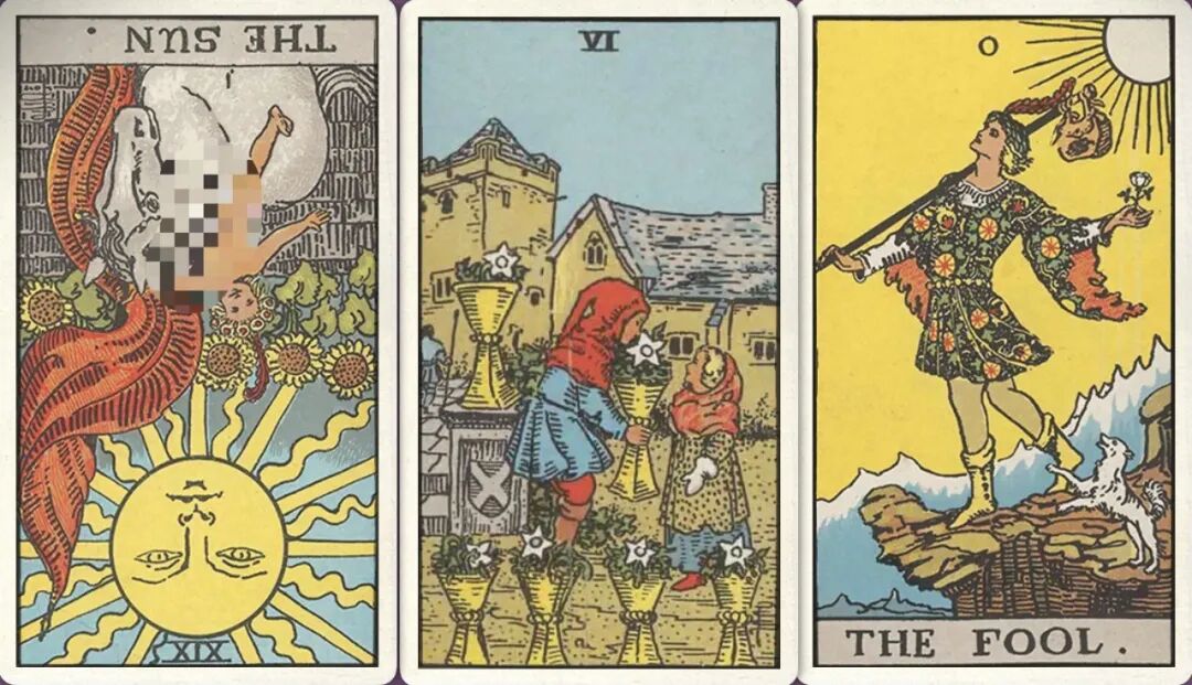 牌:太阳- 圣杯六+ 愚人+