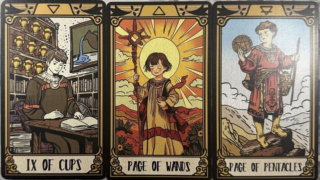 牌:圣杯九+ 权杖侍从+ 星币侍从+