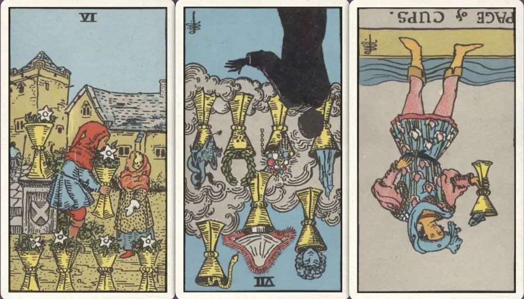 牌:圣杯六+ 圣杯七- 圣杯侍从-