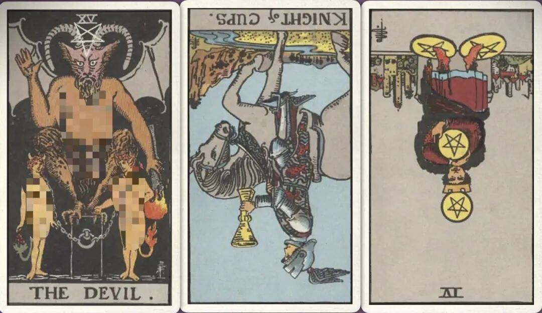 牌:恶魔+ 圣杯骑士- 星币四-