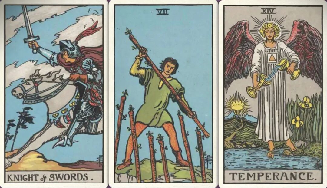 分析:两张宝剑牌,可以看出在十月下旬你不仅内心焦虑,压力也有点大!当然了,你在未来里是会注意调节自己的情绪,也会有适当的运动来照顾好自己的。因此你未来里的健康情况属于,如果你积极向上,身体倍儿棒,如果你焦虑压抑,可能那几天身体也会不太舒服。而愚人牌面上阳光灿烂的,也提醒你,未来里应该多到户外走走,甚至可以进行一个短途旅行,对你健康都有帮助哦!