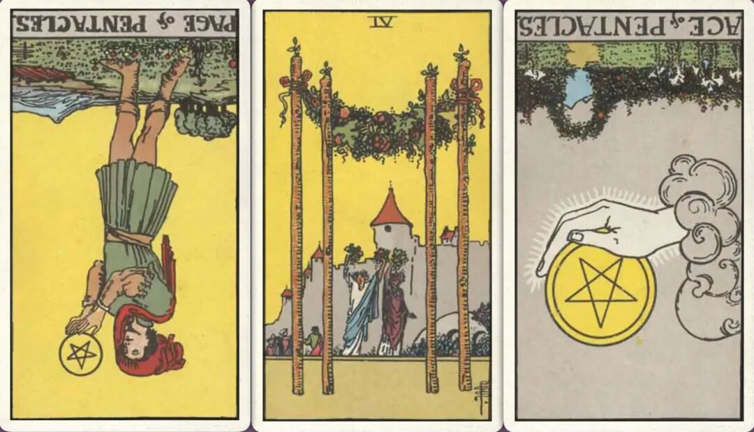 牌:星币侍从- 权杖四+ 星币ace牌-