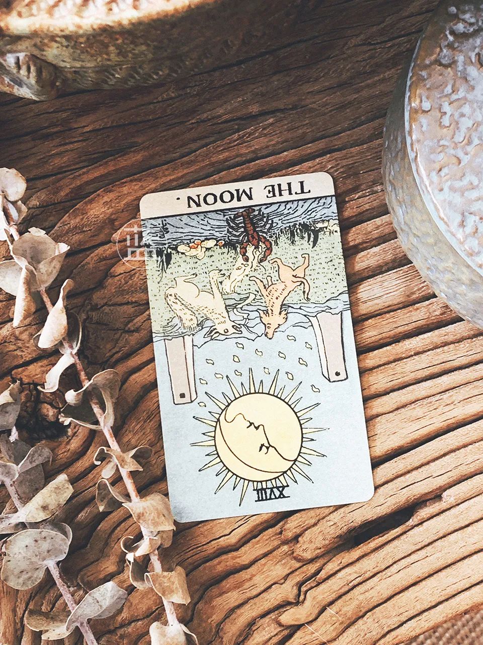 月亮牌所影射的是潜伏在内心中的那些惶恐和不安,可能将通过梦境或现实一一浮现。而逆位则暗示着内心的困惑和不安仍在延续,你可能想要逃避,但越是逃避就越是走不出内心的迷惘。如果说正位直指了你内心的那些困顿,那么,逆位则是在提醒你要去直面这些问题了。