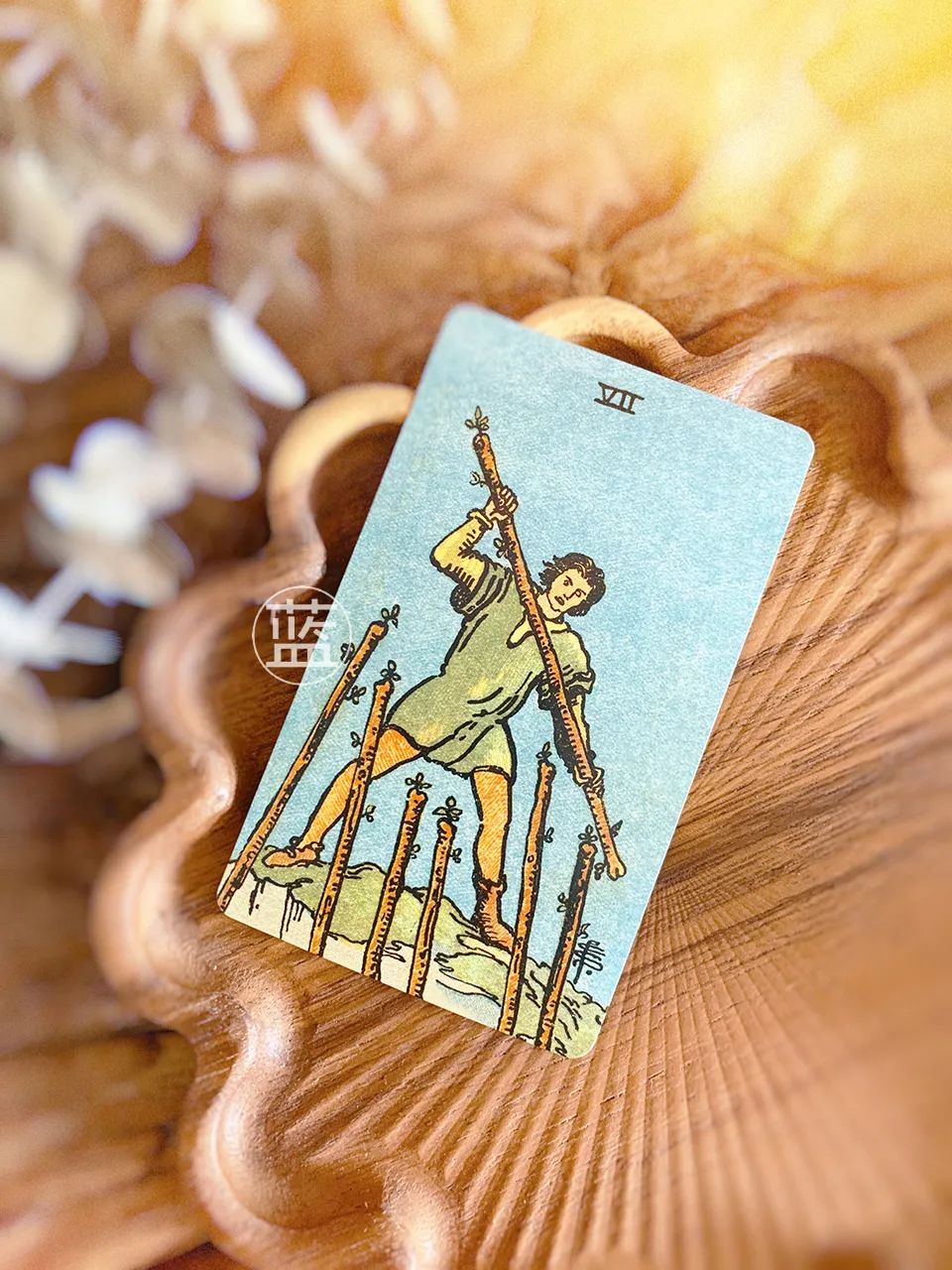 权杖7象征着博弈,这种博弈既有外在因素的干扰,也有内在因素的挣扎,但总的来说,还是比较积极乐观的状态。在这种状态下,之前一些可能困扰你的心结将会得到释怀,不过,你大概率最终还是会坚持自己的某些想法,做出某些决定。
