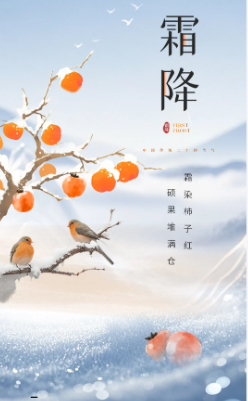 霜降在传统文化中被赋予了丰富的人文意蕴。历代文人墨客常借霜降抒发情怀。白居易的“霜降水返壑,风落木归山”描绘了季节轮回的必然;岑参的“北风卷地白草折,胡天八月即飞雪”则写出了霜降时节的肃杀景象。在古人眼中,霜既是纯洁的象征,也代表着岁月的沧桑。“风刀霜剑”比喻环境的严酷,“饱经风霜”形容经历的磨难,“霜鬓”则暗示年华老去。这些诗词和成语,将自然现象与人生感悟巧妙结合,展现出中国人独特的审美和哲学思考。