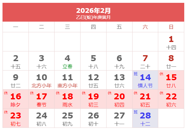 放假:2月15日 ~ 23日(腊月廿八 ~ 正月初七),注:腊月廿九是除夕,2月17日是春节。