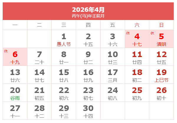 放假:4月4日 ~ 6日(周六 ~ 周一),注:4月5日是清明。