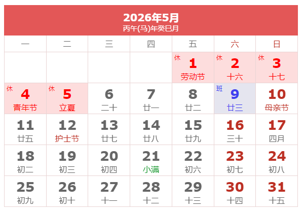 放假:5月1日 ~ 5日(周五 ~ 周二)