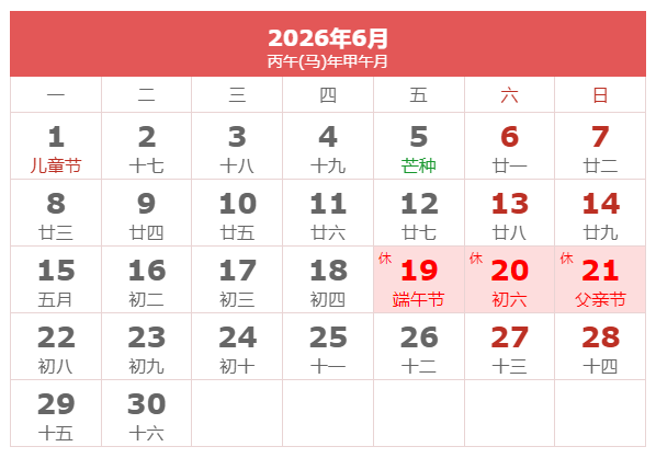 放假:6月19日 ~ 21日(周五 ~ 周日),注:19日是端午节,21日是父亲节