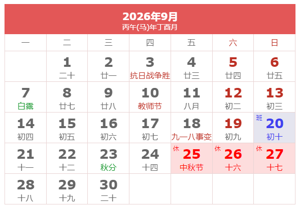 放假:9月25日 ~ 27日(周五 ~ 周日),注:25日是中秋节