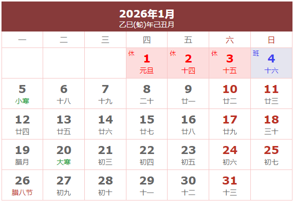 2026年元旦放假安排日历 2025-11-17 11:41:03 本站微信扫一扫 收藏 116 0 2026年元旦放假安排2026年元旦连续放假3天,从1月1日至3日(周四 ~ 周六)。但是,节后1月4日(周日)要上班,从1月4日至9日,连上6天班。元旦放假期间,高速公路不免费。具体日历安排表,如下: