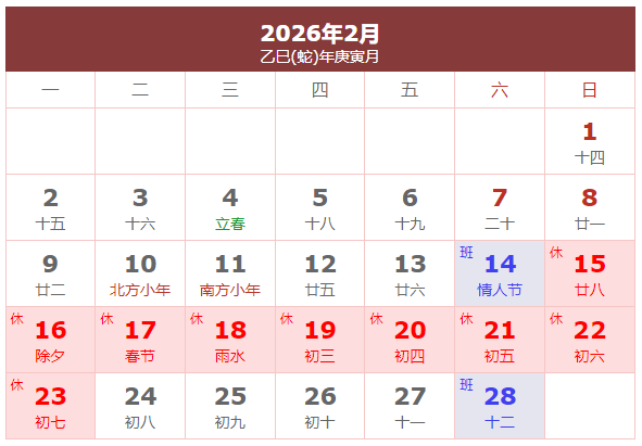 节后补班:2月28日(周六),连上5天班后,3月1日休一天,之后恢复正常。突然发现过完春节,已经是2026年3月了,大家要加油哦~