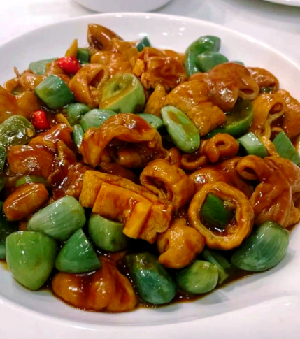 腊八蒜烧肥肠,是一道横跨季节与风味的创意融合菜。它巧妙地将腊月里清酸爽脆的时令小菜,与平日里浓香丰腴的内脏美味结合,创造出一种“金风玉露一相逢”般的味觉惊喜——腊八蒜的酸爽如利剑,劈开肥肠的厚重;肥肠的脂香如绒缎,包裹住蒜瓣的锋芒。两者在锅中经历一番“烽火交融”,最终达成酸香解腻、肥而不腻的至高境界。