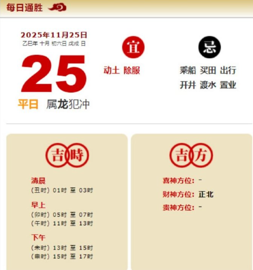 易学董老师:2025年11月25日 每日通胜+今日生肖红黑榜