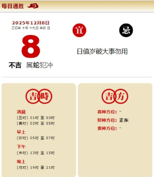 易学董老师:2025年12月8日 每日通胜+今日生肖红黑榜