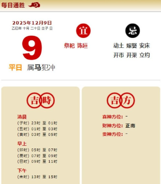 易学董老师:2025年12月9日 每日通胜+今日生肖红黑榜