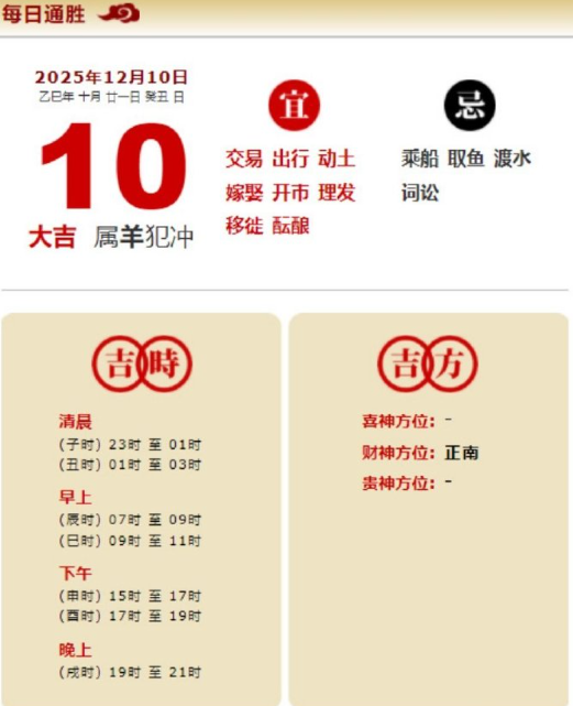 易学董老师:2025年12月10日 每日通胜+今日生肖红黑榜