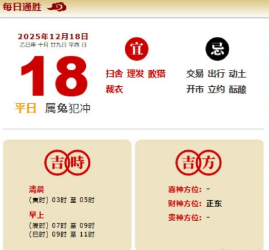 易学董老师:2025年12月18日 每日通胜+今日生肖红黑榜