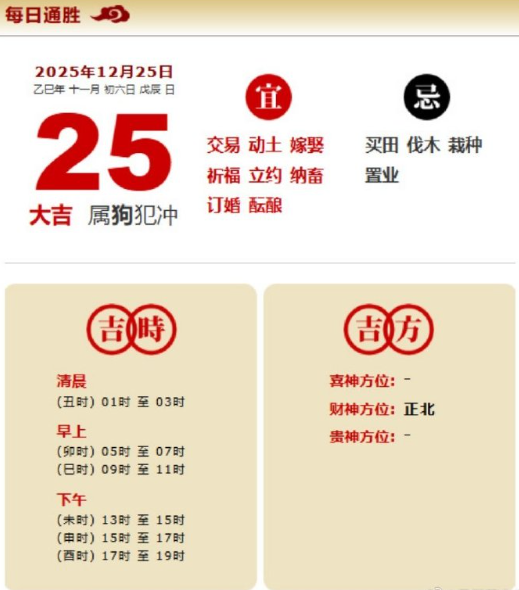 易学董老师:2025年12月25日 每日通胜+今日生肖红黑榜
