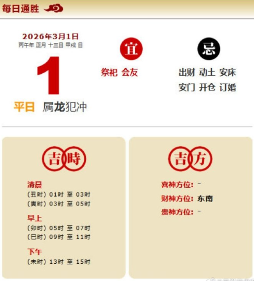 易学董老师:2026年3月1日 每日通胜+今日生肖红黑榜
