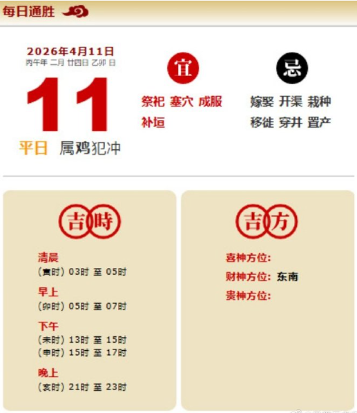 易学董老师:2026年4月11日 每日通胜+今日生肖红黑榜