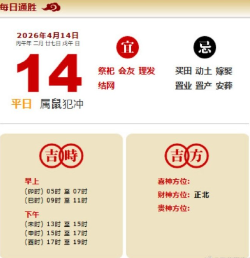 易学董老师:2026年4月14日 每日通胜+今日生肖红黑榜