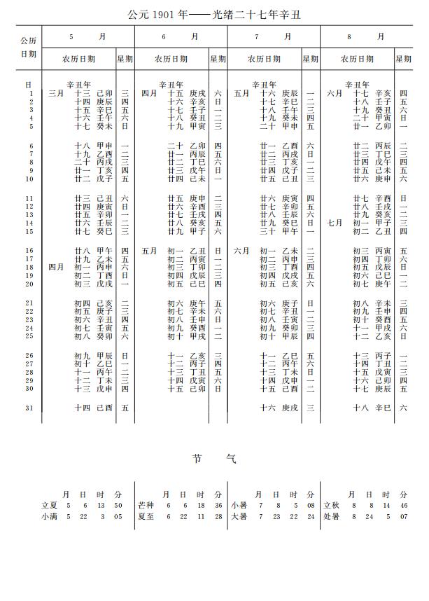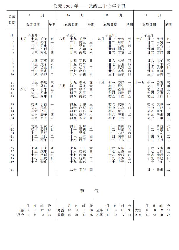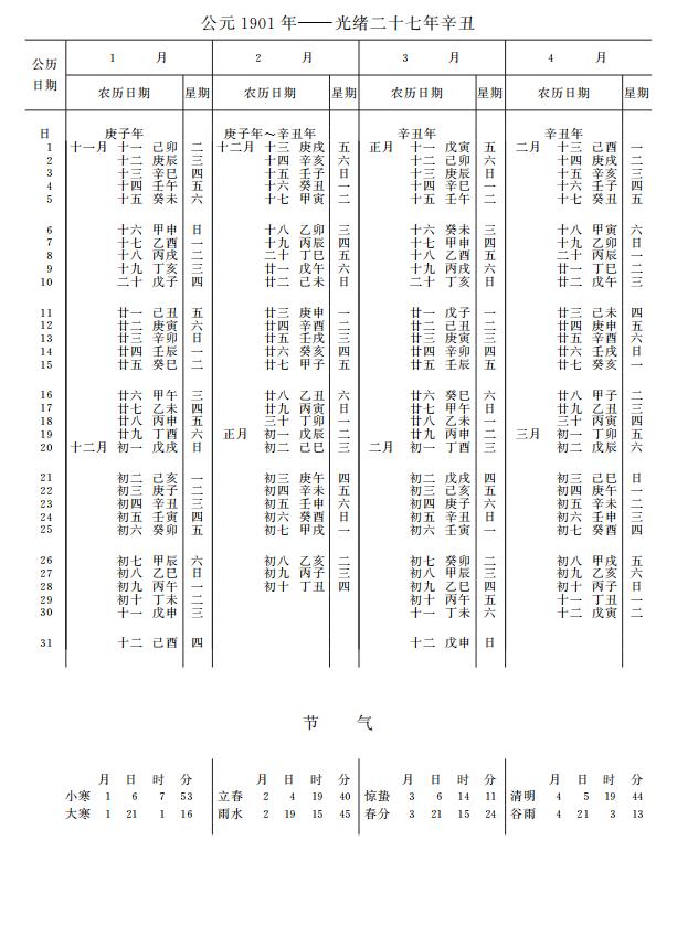 紫金山天文台万年历1901年电子版,新编万年历之1901年(辛丑牛年)