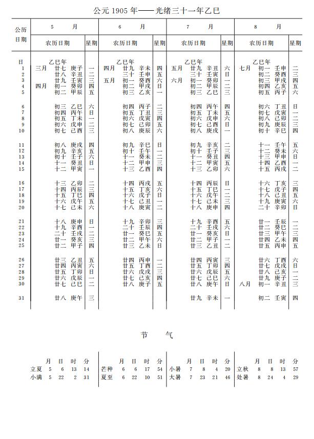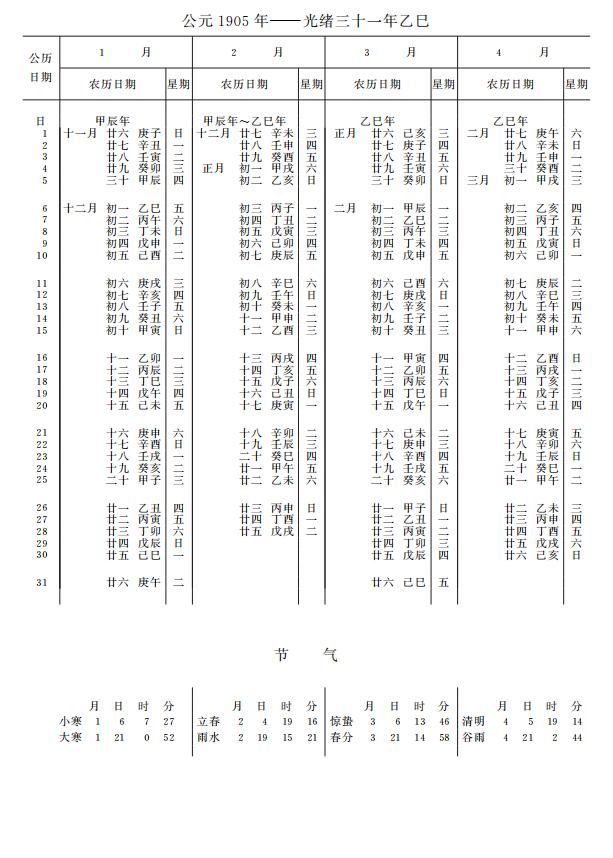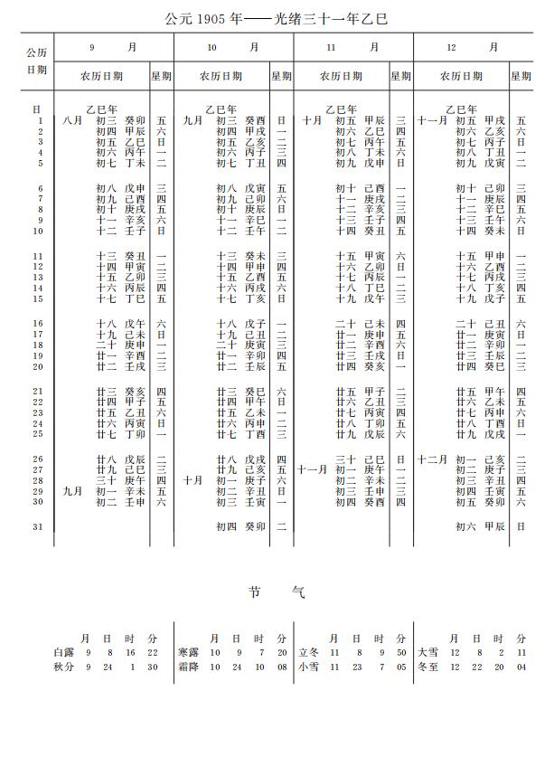 紫金山天文台万年历1905年电子版,新编万年历之1905年(乙巳蛇年)