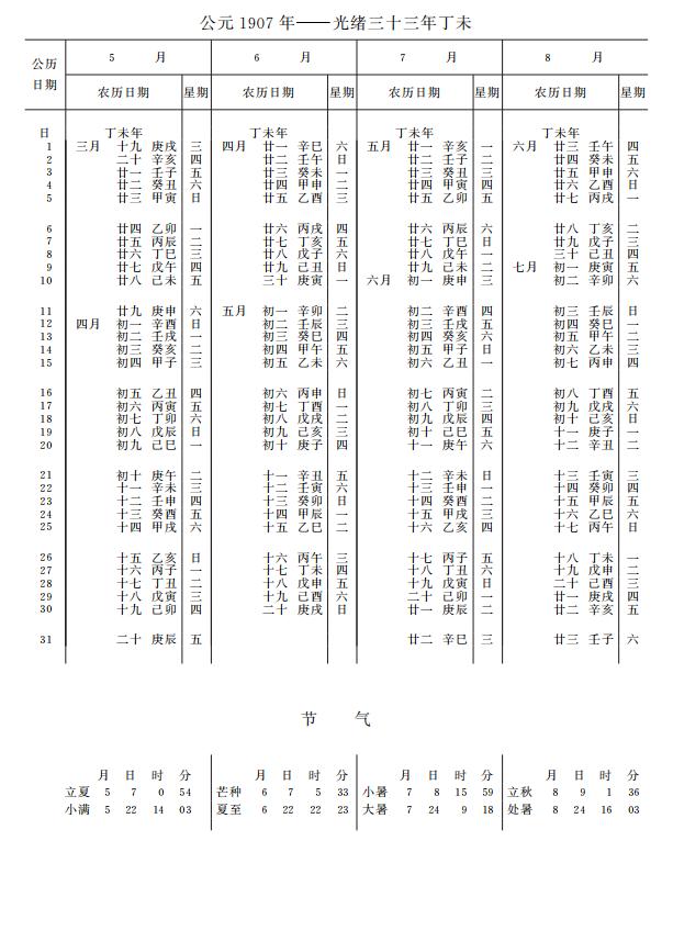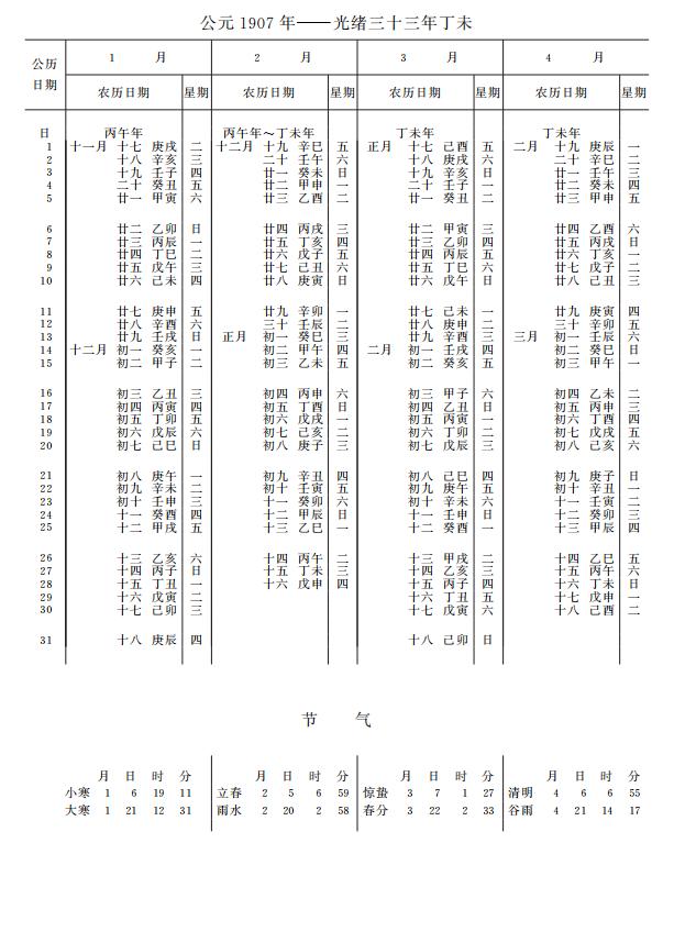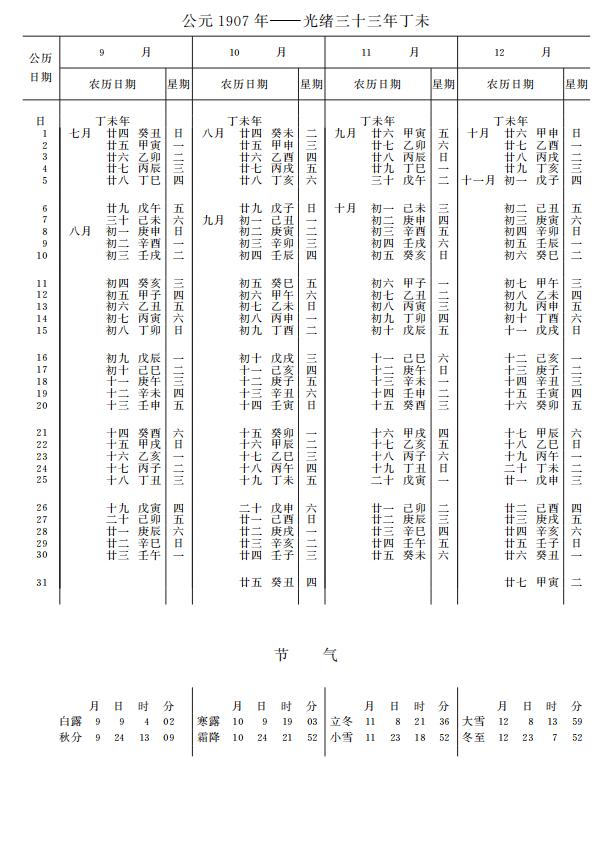紫金山天文台万年历1907年电子版,新编万年历之1907年(丁未羊年)