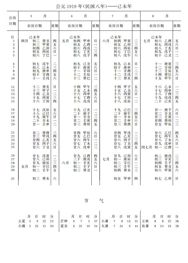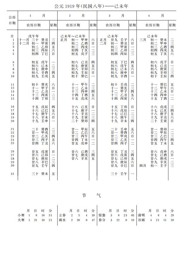 紫金山天文台万年历1919年电子版,新编万年历之1919年(己未羊年)