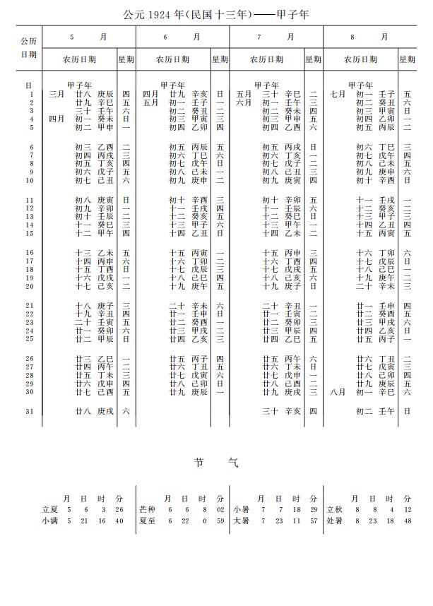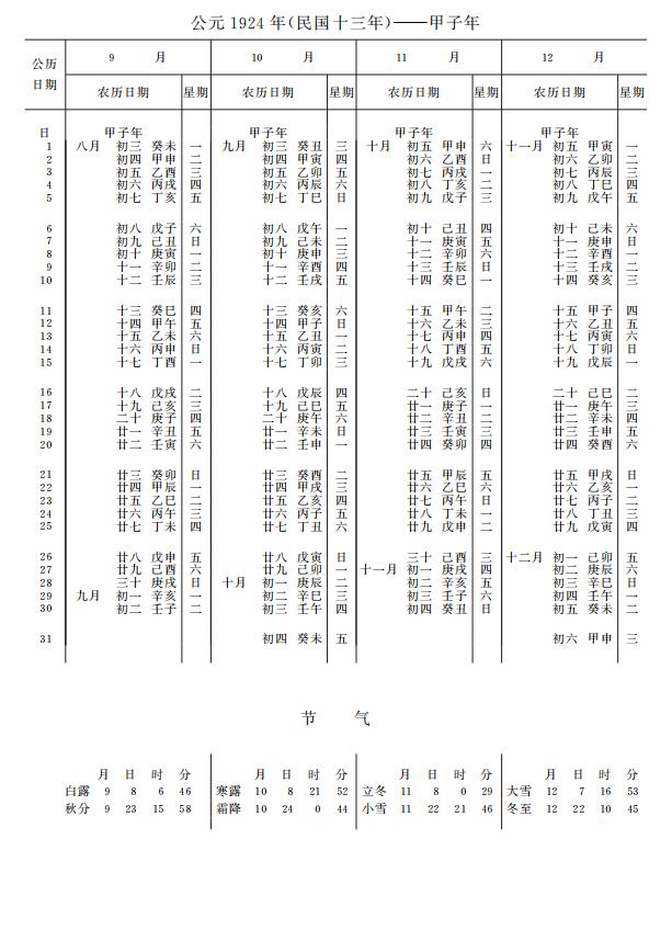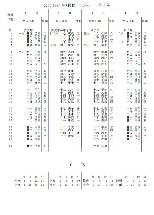 紫金山天文台万年历1924年电子版,新编万年历之1924年(甲子鼠年)