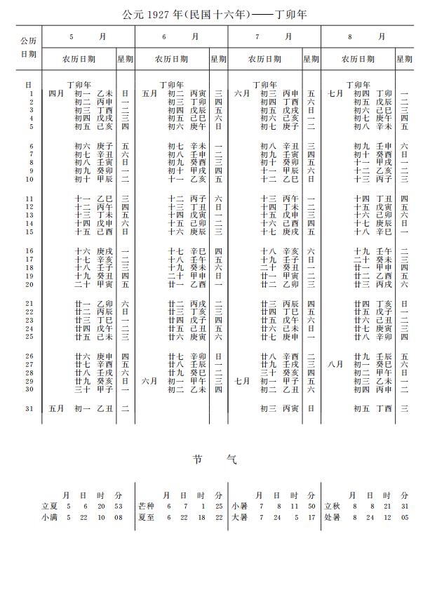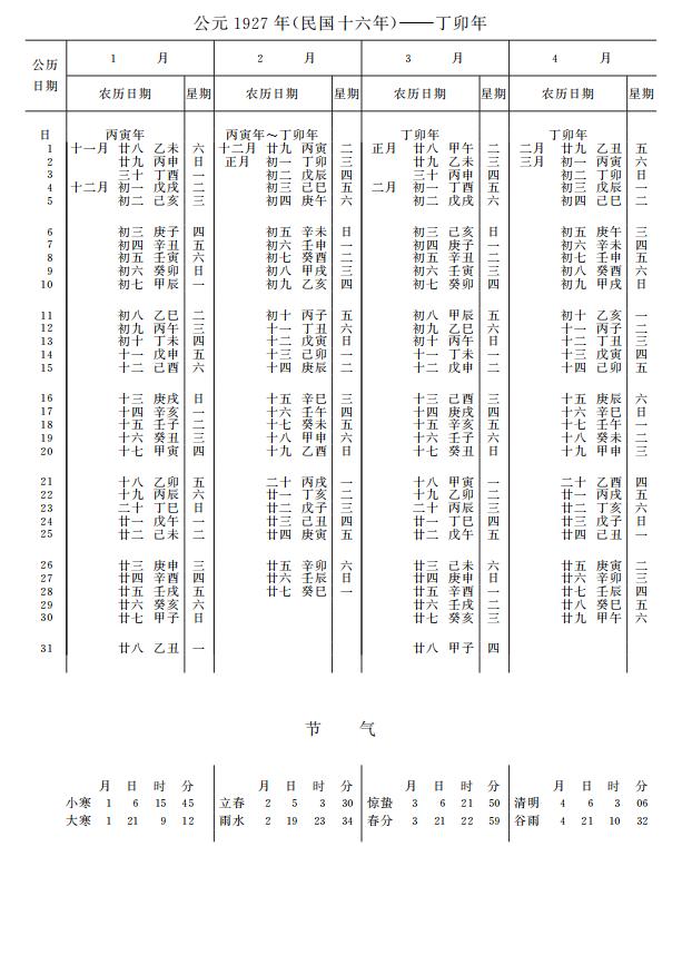 紫金山天文台万年历1927年电子版,新编万年历之1927年(丁卯兔年)
