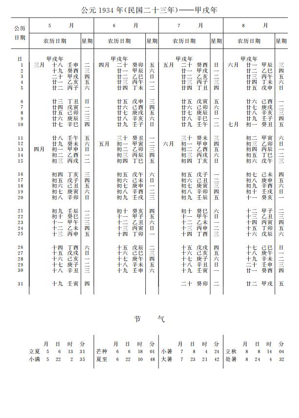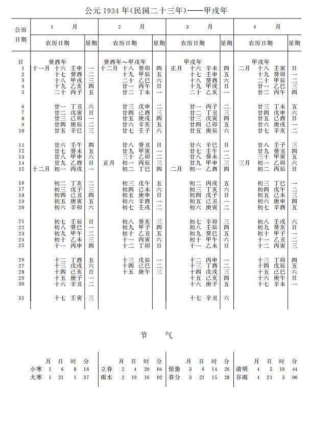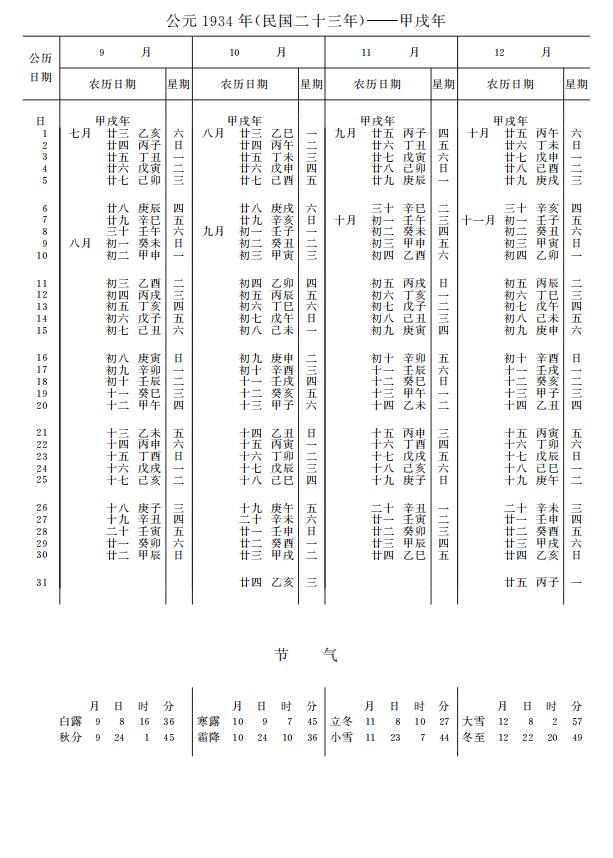 紫金山天文台万年历1934年电子版,新编万年历之1934年(甲戌狗年)