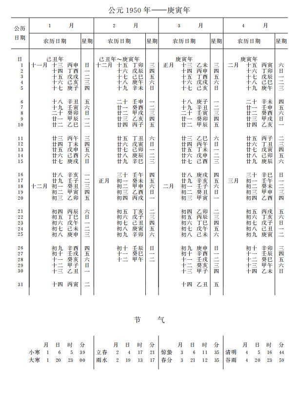 紫金山天文台万年历1950年电子版,新编万年历之1950年(庚寅虎年)