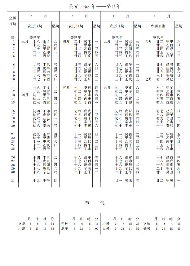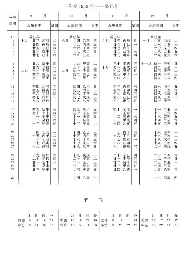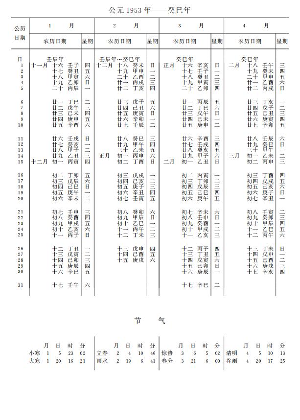 紫金山天文台万年历1953年电子版,新编万年历之1953年(癸巳蛇年)