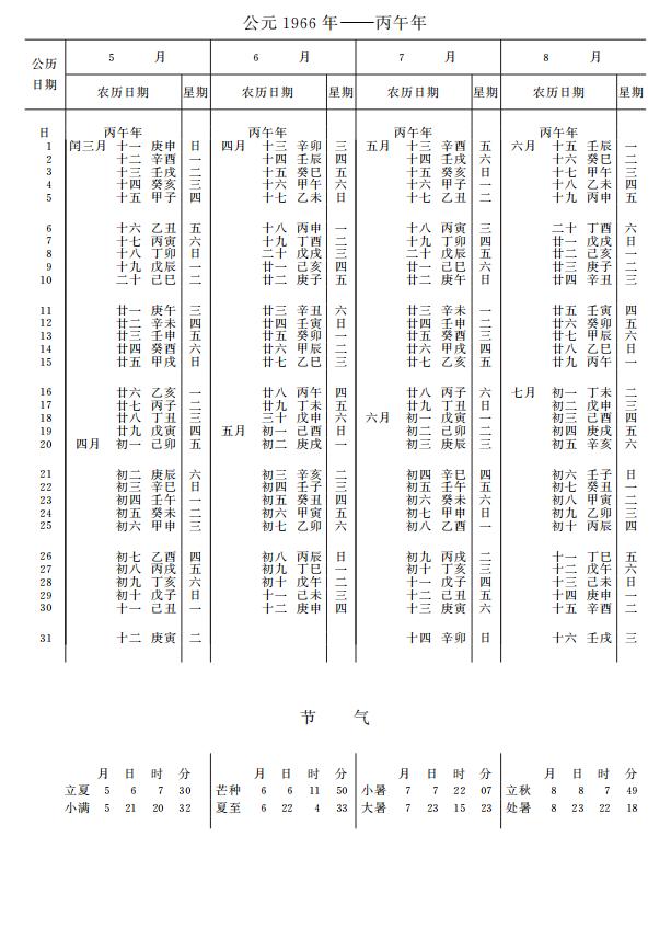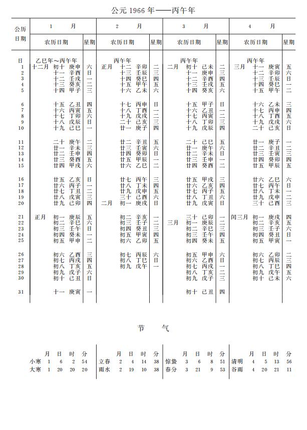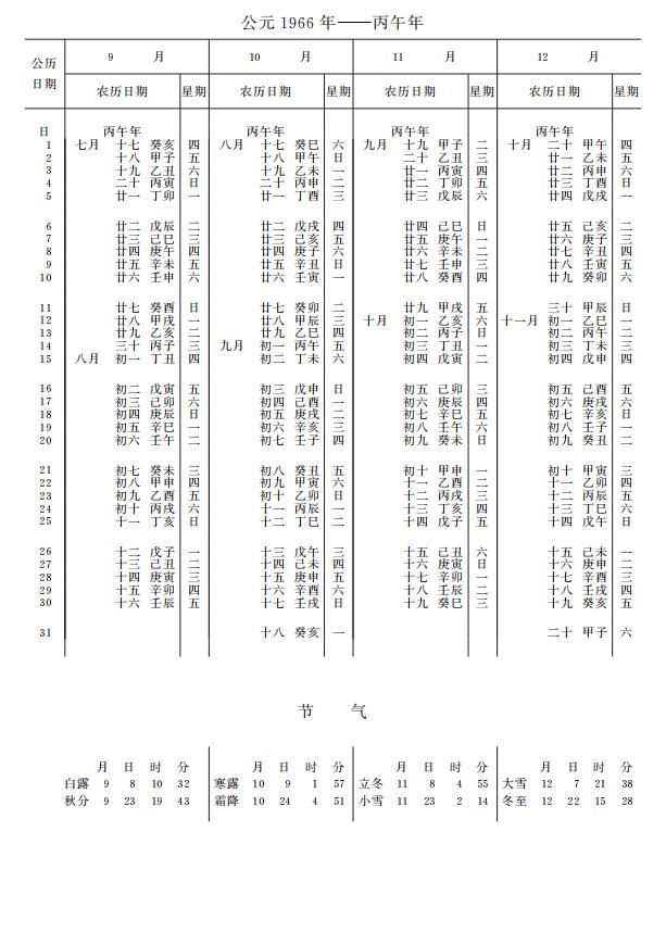 紫金山天文台万年历1966年电子版,新编万年历之1966年(丙午马年)