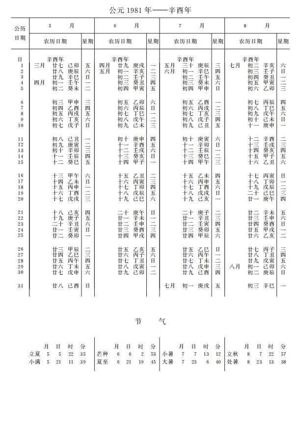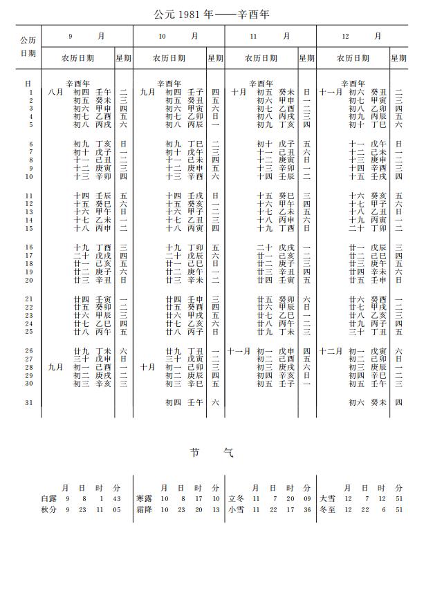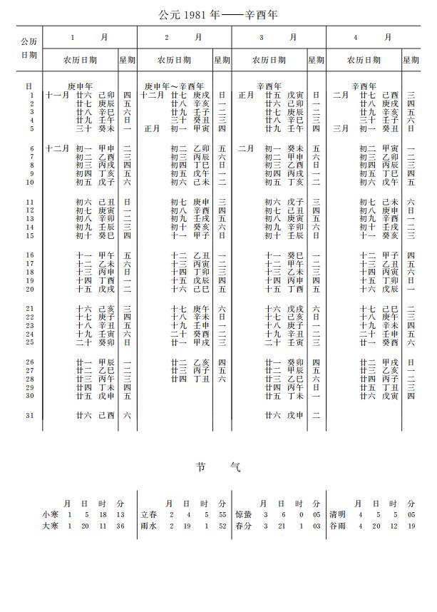 紫金山天文台万年历1981年电子版,新编万年历之1981年(辛酉鸡年)